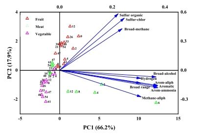 此外,电子鼻数据的PCA分析表明,根据发酵类型和日期,从渗滤液中释放的气体分类显著。在这种情况下,考虑了构成电子鼻的几个传感器的电位来对渗滤液气体进行分类。所有传感器都与第一排序轴呈正相关,而只有含硫有机物、硫氯和广谱甲烷与第二排序轴呈主要正相关,而其他传感器则呈负相关。第一和第二成分解释的方差分别为66.2%和17.9%。所有传感器都显示出渗滤液气体与整个水果发酵周期和其他废物之间存在高度显著的分离。水果废物含硫化物较少,而蔬菜和肉类废物含硫化物较多。此外,这些结果证实了通过GC-MS数据获得的来自水果和蔬菜废弃物的VOCs的鉴别,这表明电子鼻可以成为检测VOCs组成差异的有用工具。