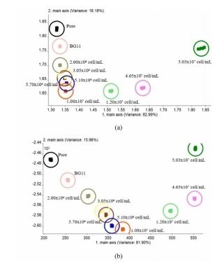 利用电子鼻对铜绿微囊藻在 BG11 培养基中不同浓度下的气味进行了分析,结果如图 6(a)所示。前两个主成分约占总方差的 99.17%,其中第一主成分(PC1,x 轴)占比超过 85.00%,这表明它能够代表各个密度下的所有样本。沿着第一主成分(PC1)方向,铜绿微囊藻的气味响应值随着藻细胞密度的增加而升高。此外,细胞密度在 1.08×10?个细胞 / 毫升至 5.53×10?个细胞 / 毫升之间时,其挥发性成分没有重叠,这说明电子鼻具有足够的分辨能力来区分高密度(如超过 10?个细胞 / 毫升)下的气味。